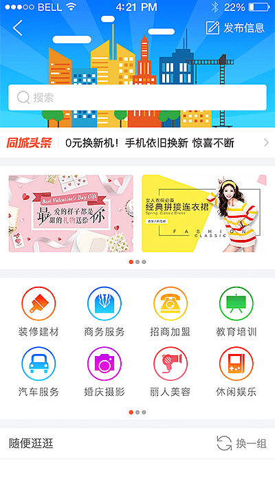 裝修建材、商務服務、招商加盟、教育培訓、汽車服務、婚慶攝影、麗人美妝、休閑娛樂、倉庫等等。同城生活本地服務大全,一部手機,匯聚全城生意。